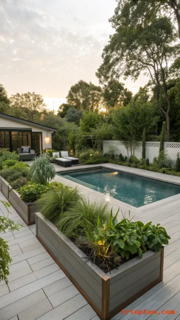 Raised planters define the pool space. They add greenery without taking up deck width. They also guide foot traffic in a neat way.
