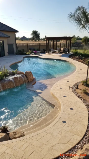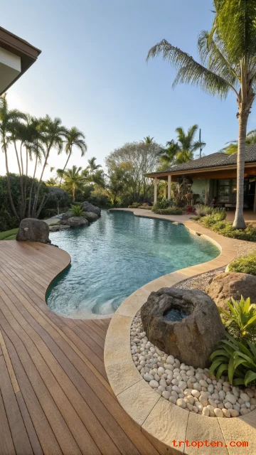 Use a pebble finish for a natural water look. Add boulders only in one area so the design stays balanced. Choose warm-toned decking to match the curves.