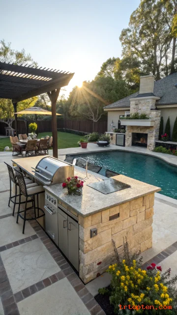 An outdoor kitchen turns the pool into an entertainment hub. You cook, serve, and relax without going inside. It also keeps parties moving smoothly.