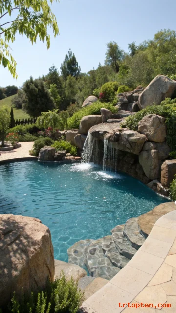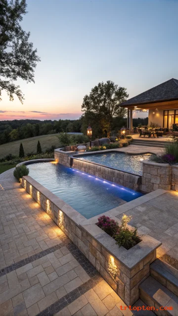 A waterfall adds sound and movement. It can also hide pool equipment lines behind rock. This feature works best when it looks intentional, not crowded.