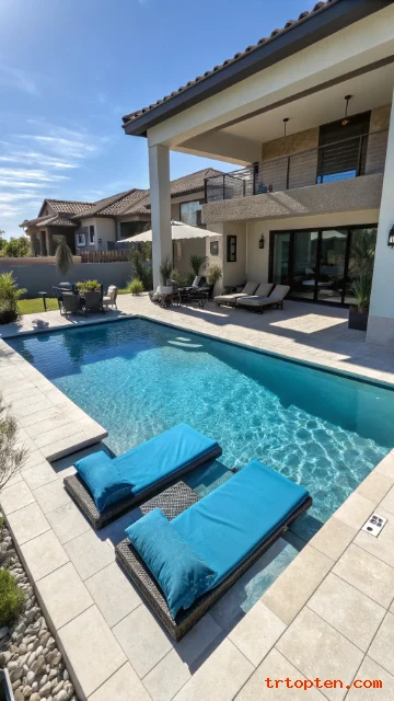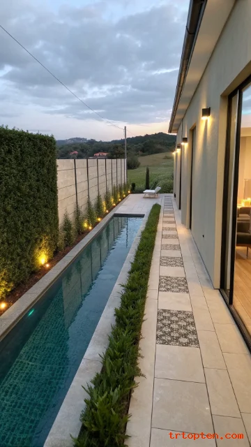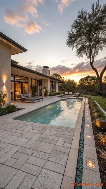 Use large-format pavers to keep the deck calm. Add a single row of waterline tile in a bold color for contrast. Place low lighting along the long edges for a sleek night view.