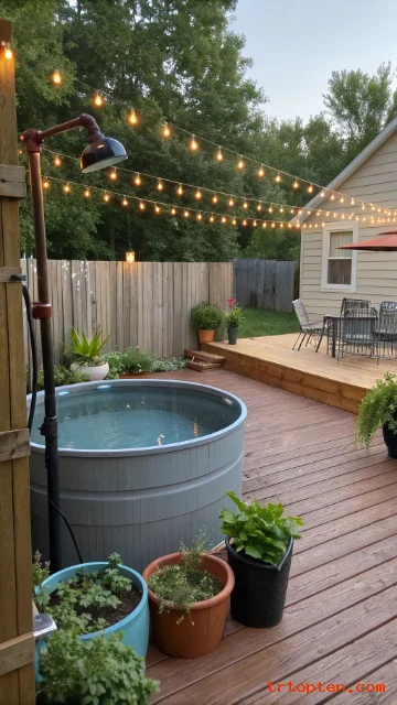 Stain the deck to match your outdoor furniture. Add a simple outdoor shower nearby for rinsing. Use string lights overhead for a cozy evening vibe.