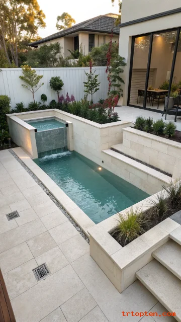 Add a slim deck border to save space and keep walking paths clear. Install a single water feature so the pool sounds calm, not noisy. Use a glass fence if you want the yard to feel open.