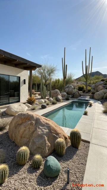 A desert pool looks clean and low-maintenance. Cactus and gravel reduce watering needs. The look feels modern and calm.