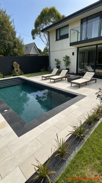 Black waterline tile adds strong contrast. It makes the water look deeper and more dramatic. This style suits modern and minimalist yards.