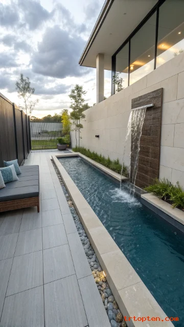 A water wall adds drama without needing a large yard. Water sheets down into the pool and hides street noise. It also creates a modern focal feature.