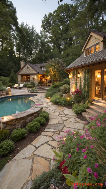 Choose tumbled stone for softer edges. Add a gravel border or flagstone path nearby. Use warm outdoor lighting to highlight the stone texture.