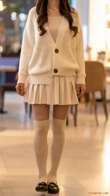 Pick soft colors like blush, cream, or light gray. Keep the socks in a similar tone for a smooth look. Finish with ballet flats for a gentle silhouette. Add a ribbon hair tie or a small pearl clip.