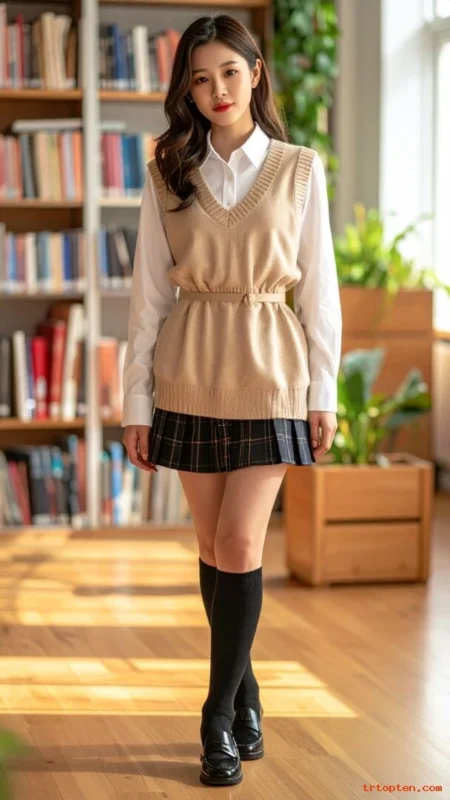 Layer a crisp button-up under a sweater vest for a classic outfit. Thigh high socks add a trendy touch without looking loud.
