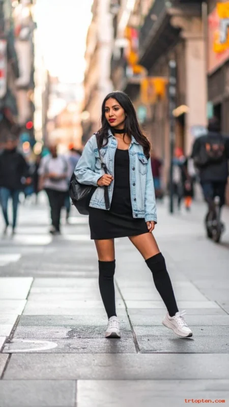 A denim jacket keeps a mini dress casual. Thigh high socks add a fun detail that stands out.