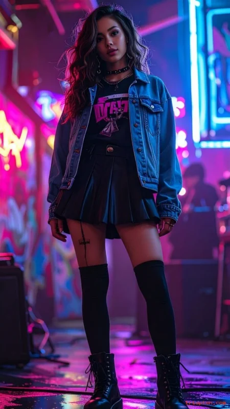 A band tee adds personality fast. Thigh high socks give the outfit a styled edge without extra effort.