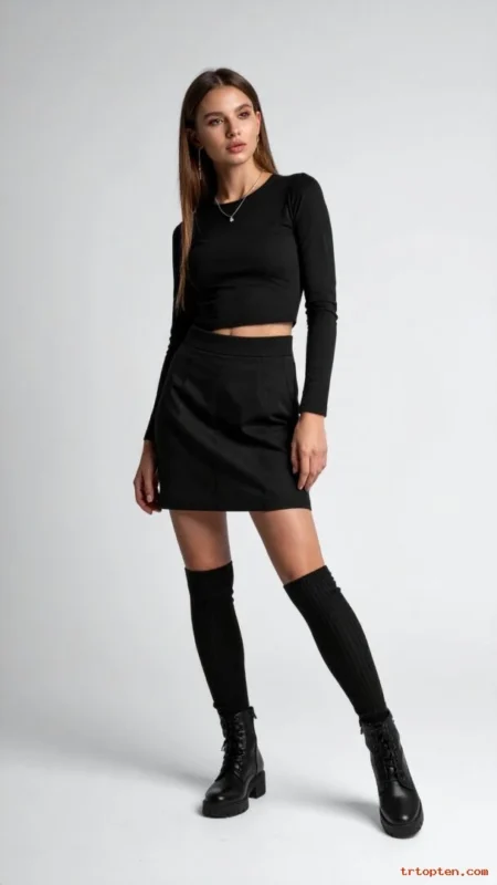 Pair a black mini skirt with a black fitted top for a clean base. Keep the sock fabric the star of the look. Add black boots and simple silver jewelry. Use a sharp eyeliner to match the mood.