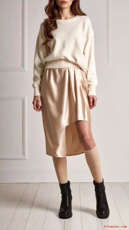 Pair the skirt with a soft sweater to mix textures. Keep socks neutral so the satin stays the focus. Add ankle boots for a clean finish. Use a small shoulder bag with a simple strap.