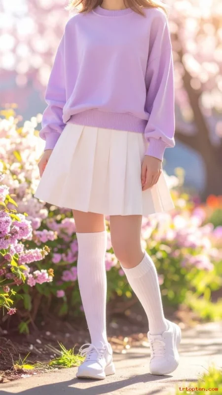 Pick a pastel sweater like lavender, mint, or baby blue. Pair it with a white skirt for a fresh base. Add white sneakers or light flats. Use a small shoulder bag in a matching pastel tone.