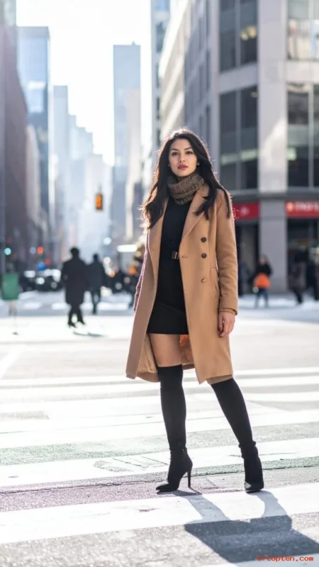 Choose a wool coat in camel, black, or gray. Keep the skirt simple so the coat leads the look.