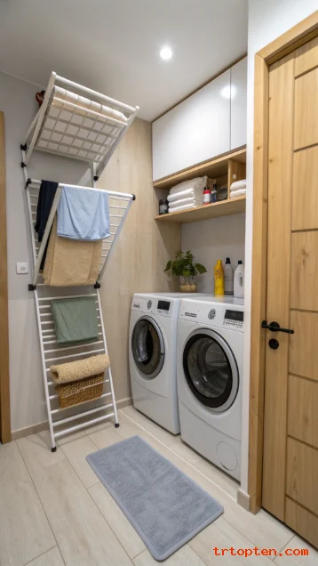 Use a fold-down rack, a hanging rod, or a retractable clothesline. These tools give drying space without eating floor area.