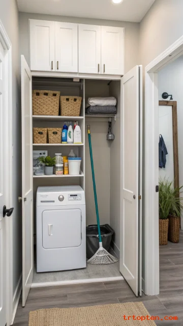 Tall, narrow storage is perfect for small laundry rooms. It keeps long tools upright and out of the way.