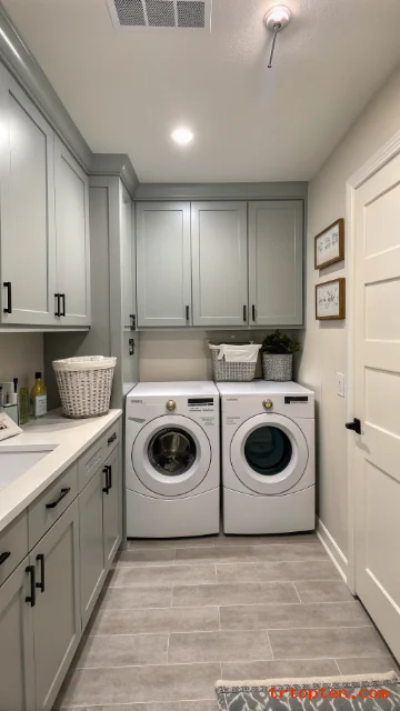 Matching cabinet and wall color reduces visual breaks and calms the room. This trick makes a small laundry area feel more open.