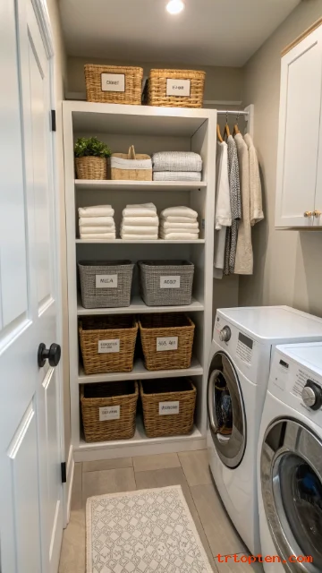 Use baskets for small items like pods, dryer sheets, and stain sticks. Label the baskets so anyone can find what they need.