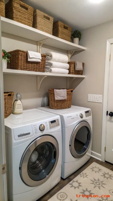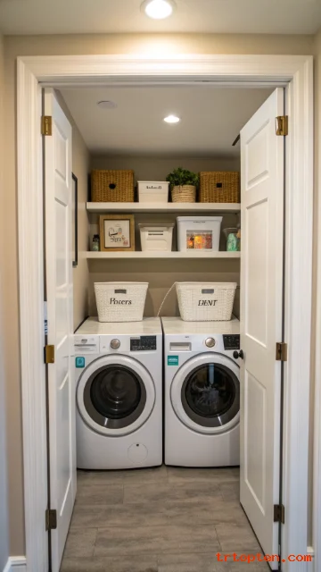 Add a shelf above the machines for detergent and stain tools, so you stop losing items behind the drum. Use labeled bins to keep the shelf tidy and quick to use.