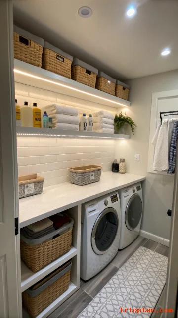 Small laundry rooms often look dim and closed. Under-shelf lighting adds glow right where you work.