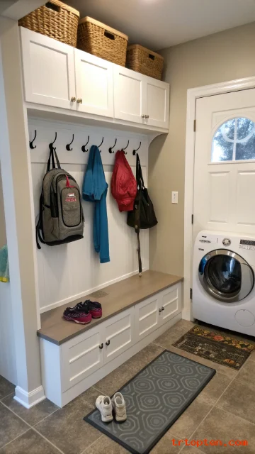 Many tiny laundry rooms sit near an entry. A small drop zone keeps clutter from spreading into the laundry area.