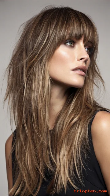 A long shag with fringe adds a relaxed shape to longer hair. The layers create movement from the crown to the ends.