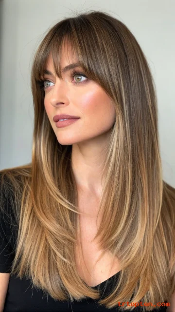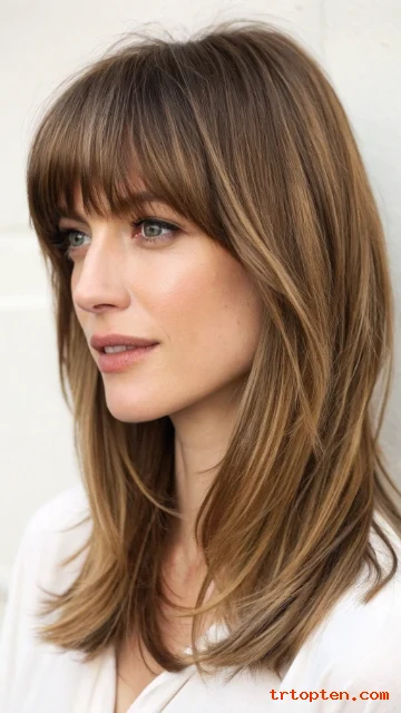 This haircut is trendy because the bangs look flattering and easygoing. The layered lengths keep the style light and balanced.