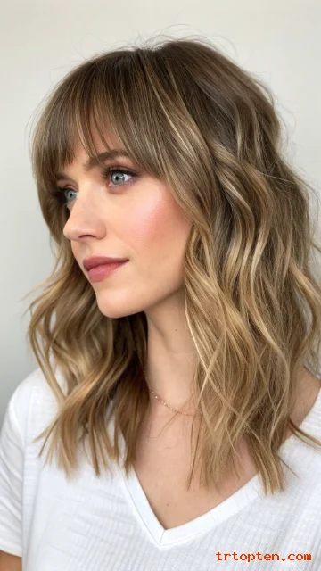 You can style the bangs with a small round brush for a soft curve. This cut looks great with loose waves and natural texture.