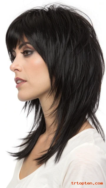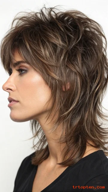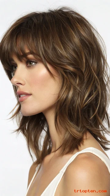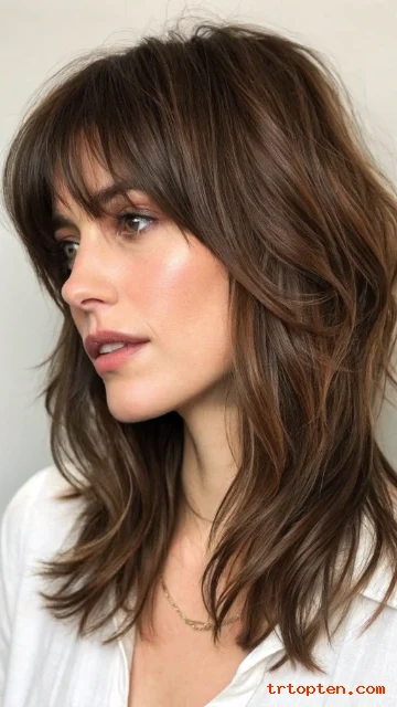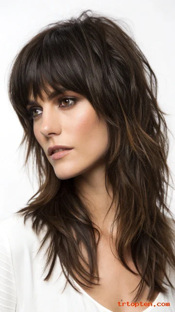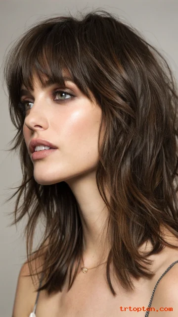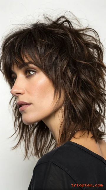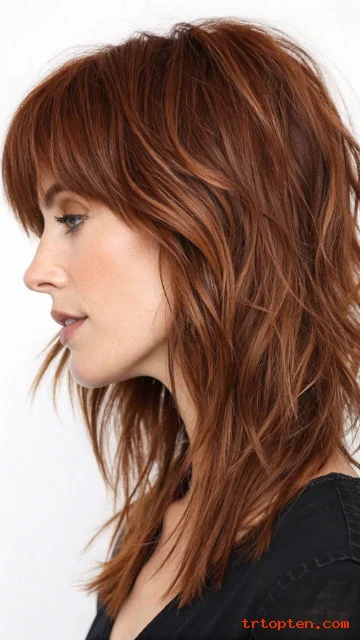 A razor-cut shag gives the ends a lighter, edgy feel. A textured fringe sits across the forehead with piecey strands. This look works well for thick hair that needs weight removal.