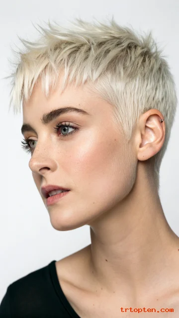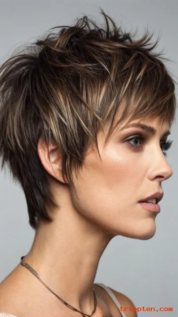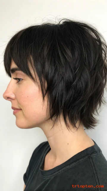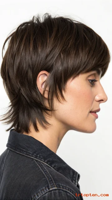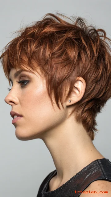 A pixie shag mixes short layers with a messy, textured finish. Micro bangs sit above the brows for a bold look. This style feels artsy and confident.
