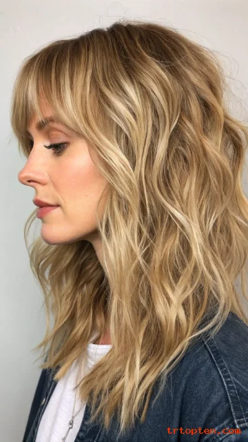 Soft waves pair perfectly with shag layers and add a relaxed finish. Bangs make the look feel intentional and styled. This is a go-to choice for everyday wear.