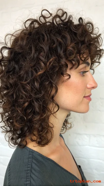 A curly shag enhances natural curls and reduces heavy bulk. Curly bangs blend into the front layers and highlight the eyes. This cut helps curls sit in a balanced shape.