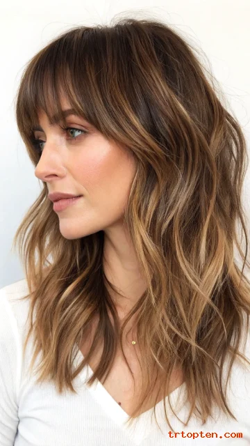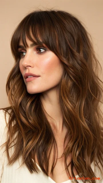 Ask for long layers that start around the collarbone for a smooth flow. Style with a large barrel iron to create loose bends, not tight curls. Brush through the bangs so they look airy and relaxed.