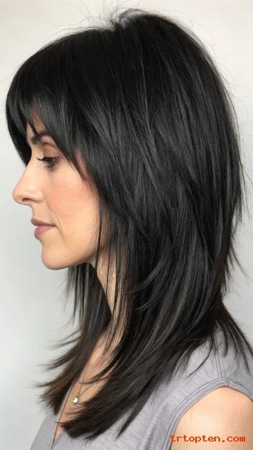 Deep side part bangs bring instant drama and lift. Shag layers add texture so the look does not feel heavy. This can also help balance round or square faces.