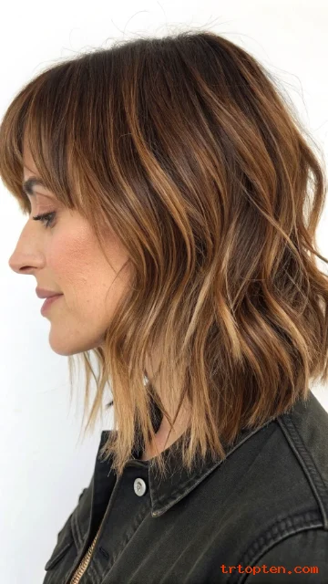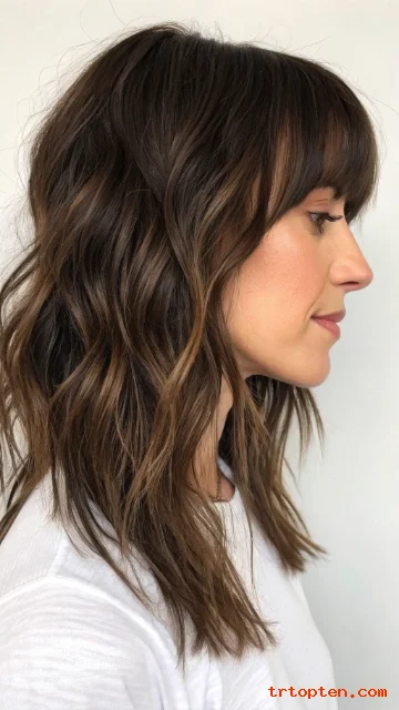 A wavy shag adds soft texture that looks effortless. Side-swept bangs angle across the forehead and blend into layers. This style flatters many face shapes and feels easy to wear.