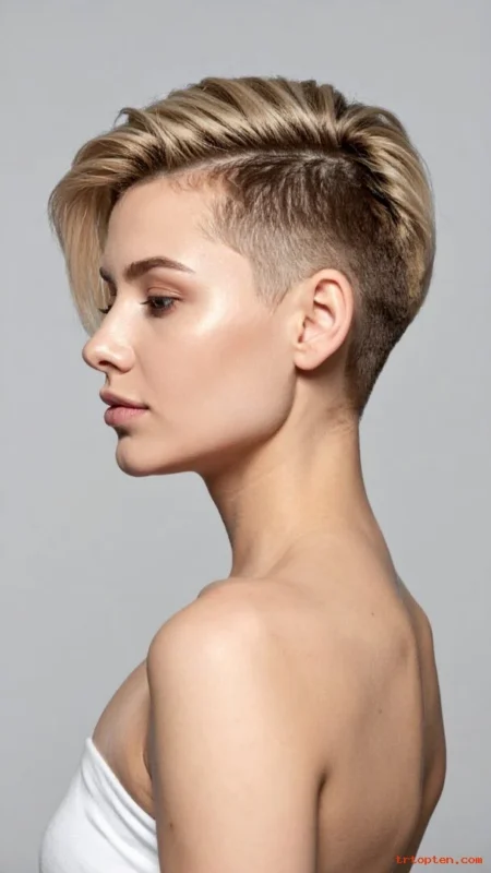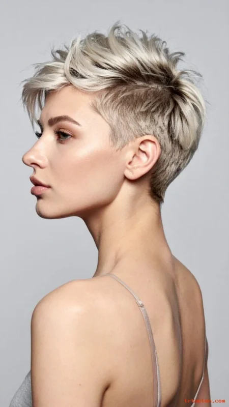 Use a round brush to lift the front and add soft volume. Finish with light hairspray so the shape stays flexible. This cut works well for fine hair that needs height. It also works well if you want a pixie that feels less bold.