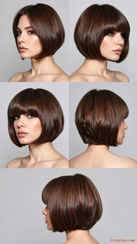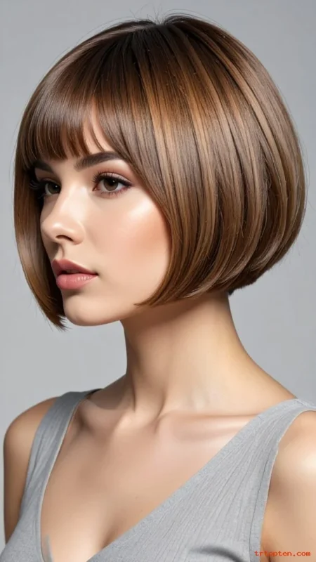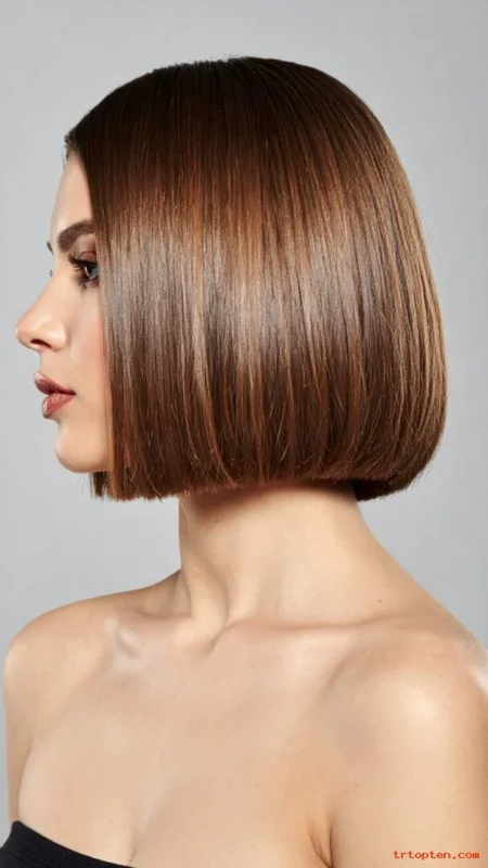 A blunt short bob creates a strong line at the jaw. The clean edge looks modern and polished.