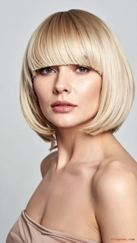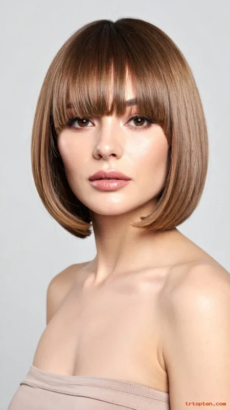 Micro bangs sit above the brows and look bold. A short bob balances the strong fringe with a clean shape.
