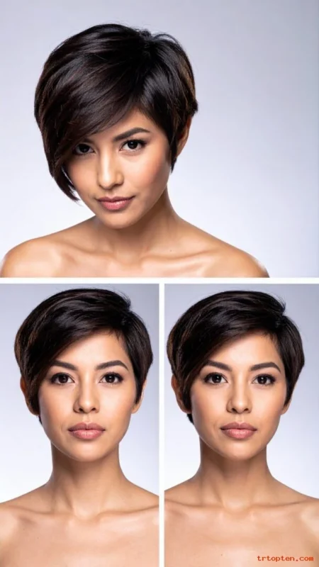 A pixie with side-swept bangs frames the eyes in a gentle way. The side fringe can soften strong angles.