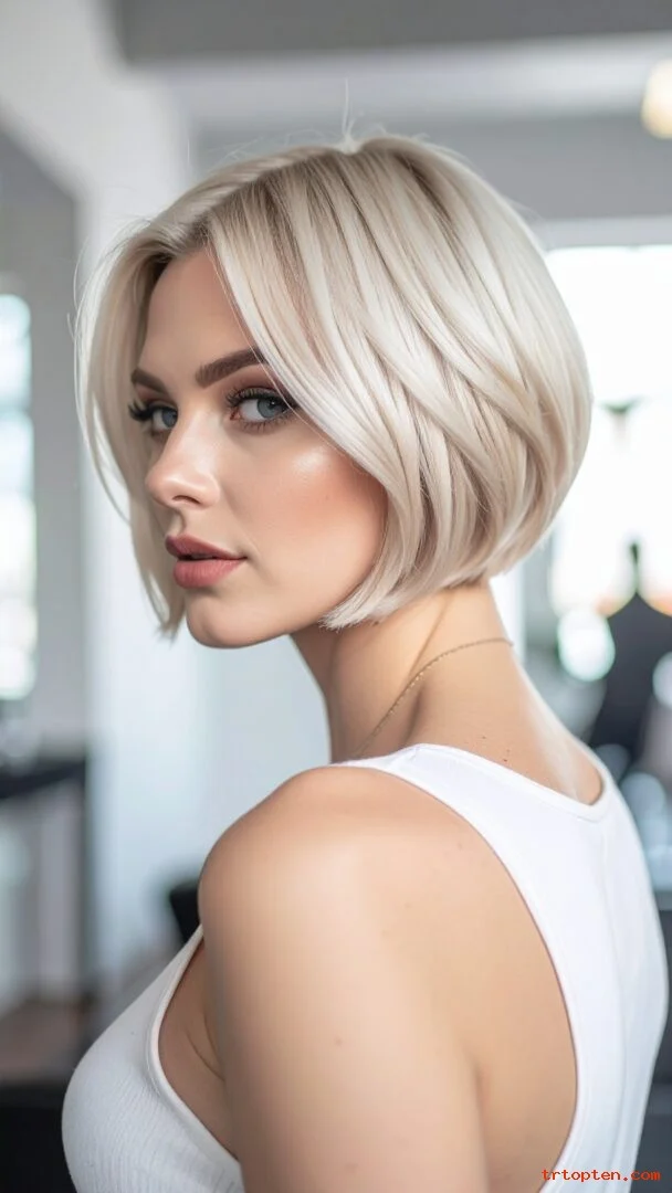 A stacked bob builds height in the back with short layers. The stacked shape gives a rounded silhouette.