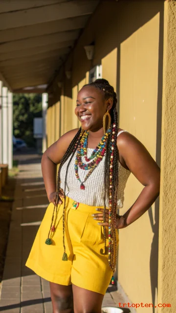 This is a strong option for short or long braids. It looks great with simple jewelry and a clean neckline. It also photographs well from above angles.