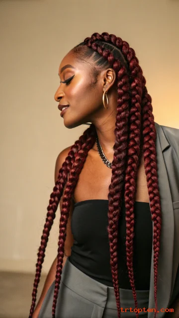 Choose a deep wine shade for a mature look. Ask for a clean part and smooth braid start. Keep edges soft so the color remains the focus.
