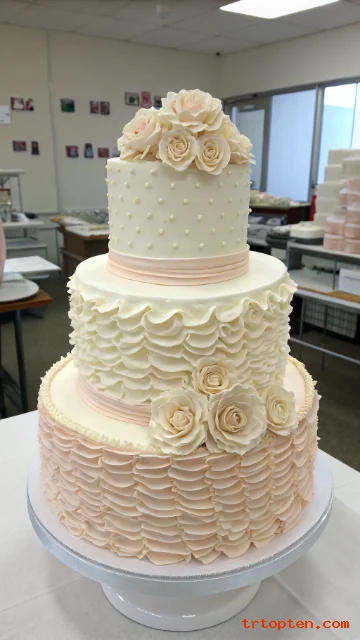 Ruffled buttercream adds softness and movement. The texture feels like fabric and looks very wedding-ready.
