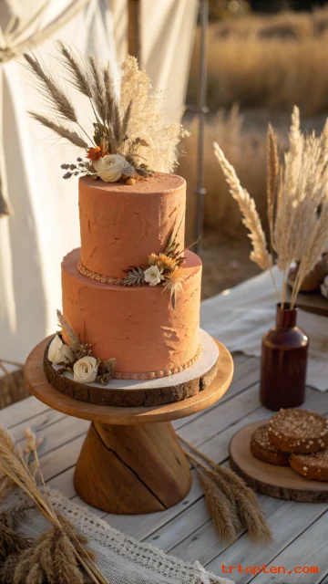 Use a matte buttercream in terracotta or clay. Add pampas and dried elements for texture.