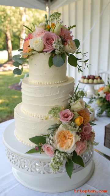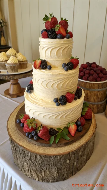 Rustic buttercream has soft swirls and a handmade look. Seasonal fruit adds color and a casual charm.