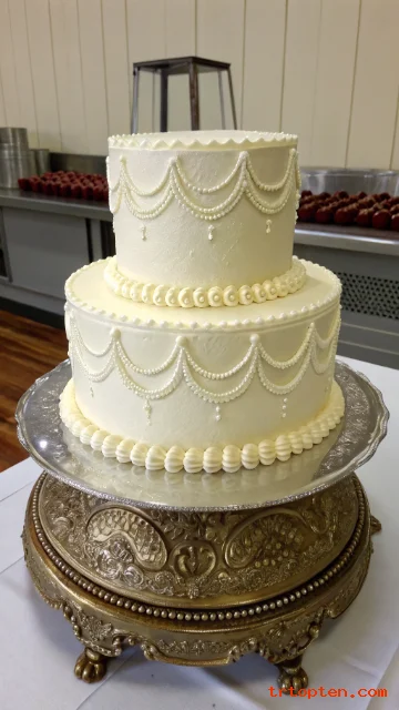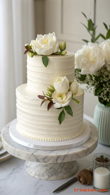 A smooth white buttercream two tier cake gives a crisp and timeless look. It pairs well with any wedding theme and it photographs cleanly under warm lights.