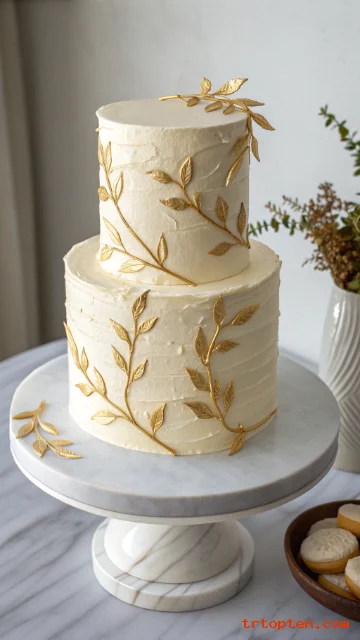 A two tier wedding cake can look very formal with smooth frosting, clean piping, and classic florals. Metallic accents also add a formal feel.