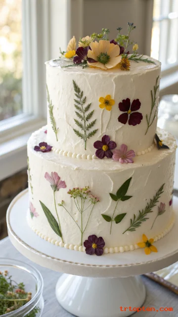 Pressed flowers create a delicate garden effect. They lie flat and look like edible artwork on the frosting.