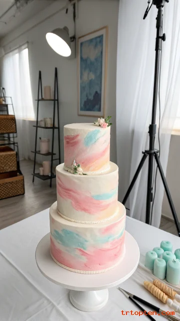 Use blush, lavender, and pale blue in a light blend. Keep the top tier lighter so the cake feels lifted.
